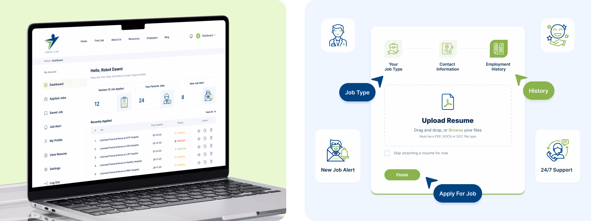 We designed "Vibrant Care" to keep users focused on their job search. The UI minimizes distractions with a clean interface and priority content placement. The underlying code is optimized for fast loading speeds and reliable performance.